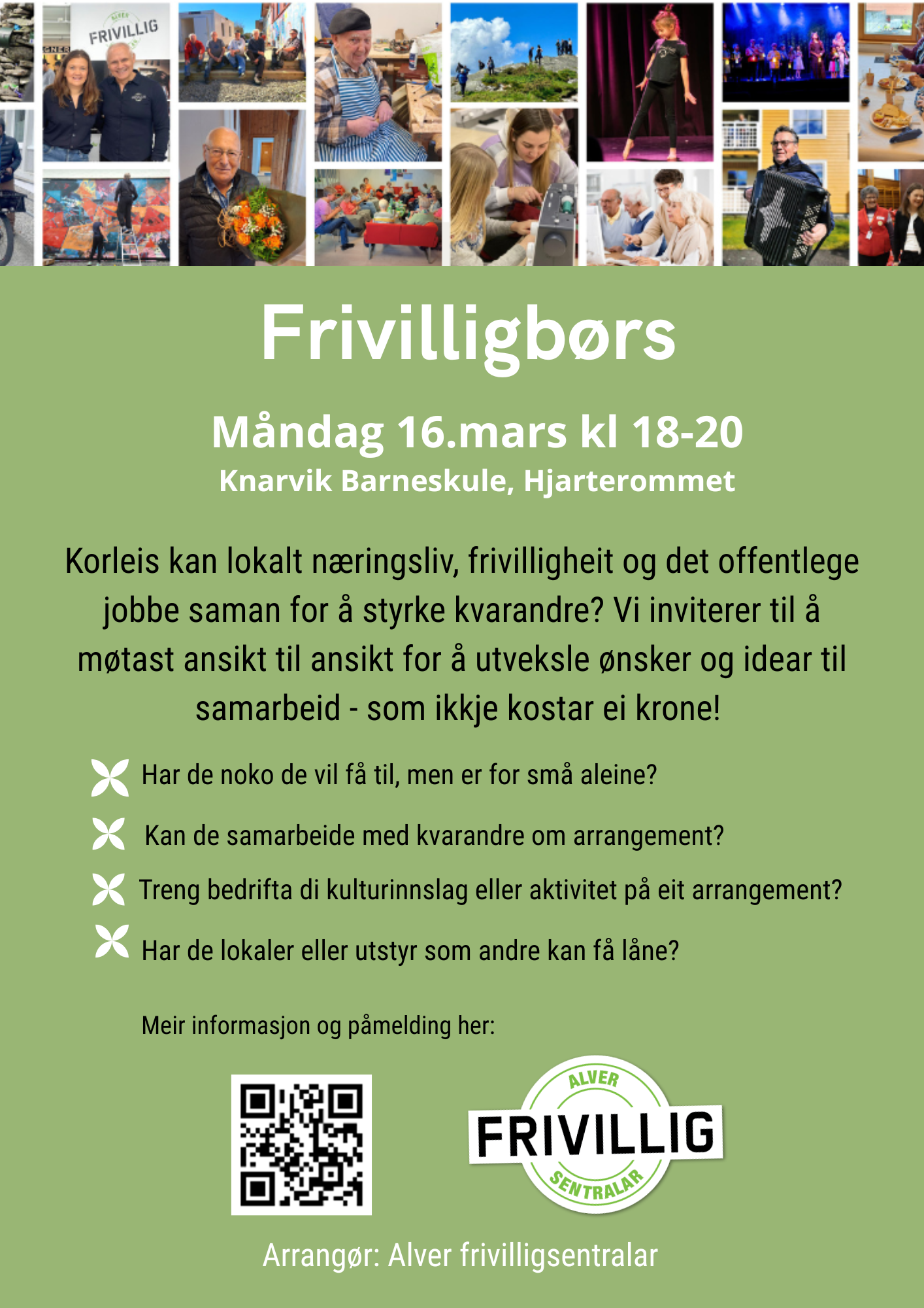 Vi introduserer Frivilligbørs i Alver! Frivilligbørs legg til rette for meir samarbeid på tvers av ulike sektorar i lokalsamfunnet. Her møtast lokalt næringsliv, frivilligheit og det offentlege ansikt til ansikt og utvekslar ønsker og idear til samarbeid - som ikkje kostar ei kroneFriviligbørs varer i to timar. Ein får informasjon i starten, deretter lagar alle til plakatar med kva dei kan tilby og kva dei kan trenge hjelp til. Deretter går børsen i gang og ein minglar i lokalet, snakkar med kvarandre og inngår avtaler om utveksling av ressursar og gjensidig hjelp. Pengar er ikkje involvert og ein kan ikkje inngå avtaler om økonomisk kompensasjon eller betalte tenester.